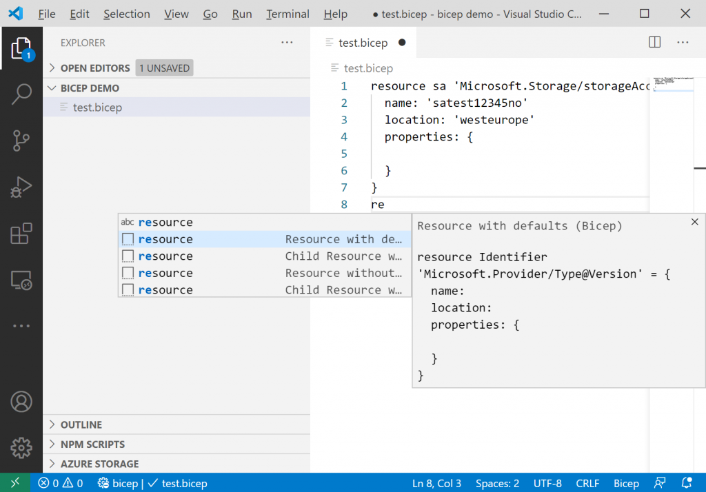 Was ist Bicep? Bicep ist eine domänenspezifische Sprache (DSL) zur deklarativen Bereitstellung von Azure-Ressourcen. Also raus aus den ARM-Templates und eine deklarativere Beschreibung nutzen, um zu definieren, was man in Azure bereitstellen möchte. Mehr über das Projekt erfährt man auf der GitHub-Seite. Mein erster Schritt war die Installation der Tooling-Komponenten für Bicep und der Erweiterung für Visual Studio Code. Die Installationsanleitung findet ihr ebenfalls auf der GitHub-Projektseite. Sobald alles installiert ist, hat VS Code Unterstützung für *.bicep-Dateien: ...
